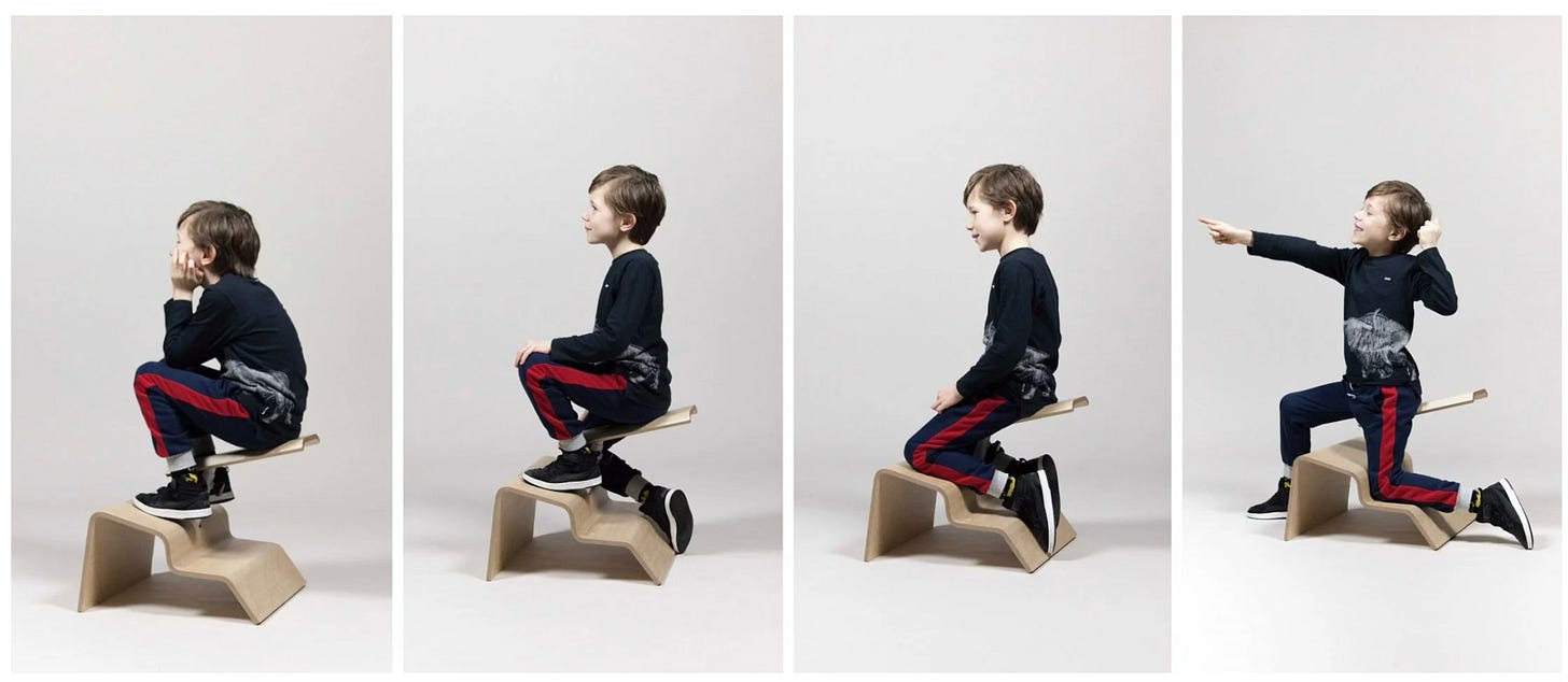 These are school chairs with multiple positions that encourage the children to regularly change their postures throughout the day in a bid to increase their "muscular diversity" as well as their concentration levels.