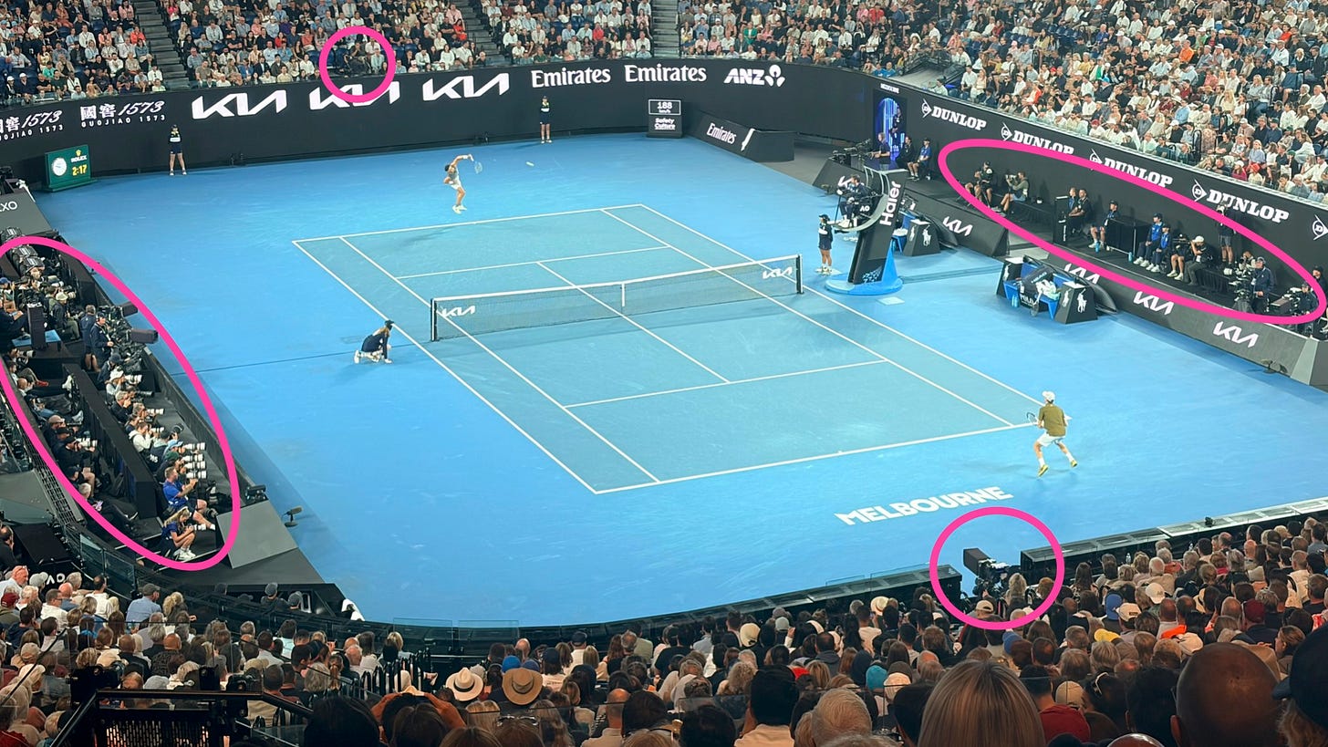 Compare that speed to a single moment at this week’s Australian Open tennis. World #8 Ben Shelton belts down a 220km/h serve to World #2 Jannik Sinner. That one stroke is captured by dozens of devices (in pink below): cameras, multiple video angles, ball-tracking technology, biometric sensors, and a phalanx of sports journalists logging every detail.